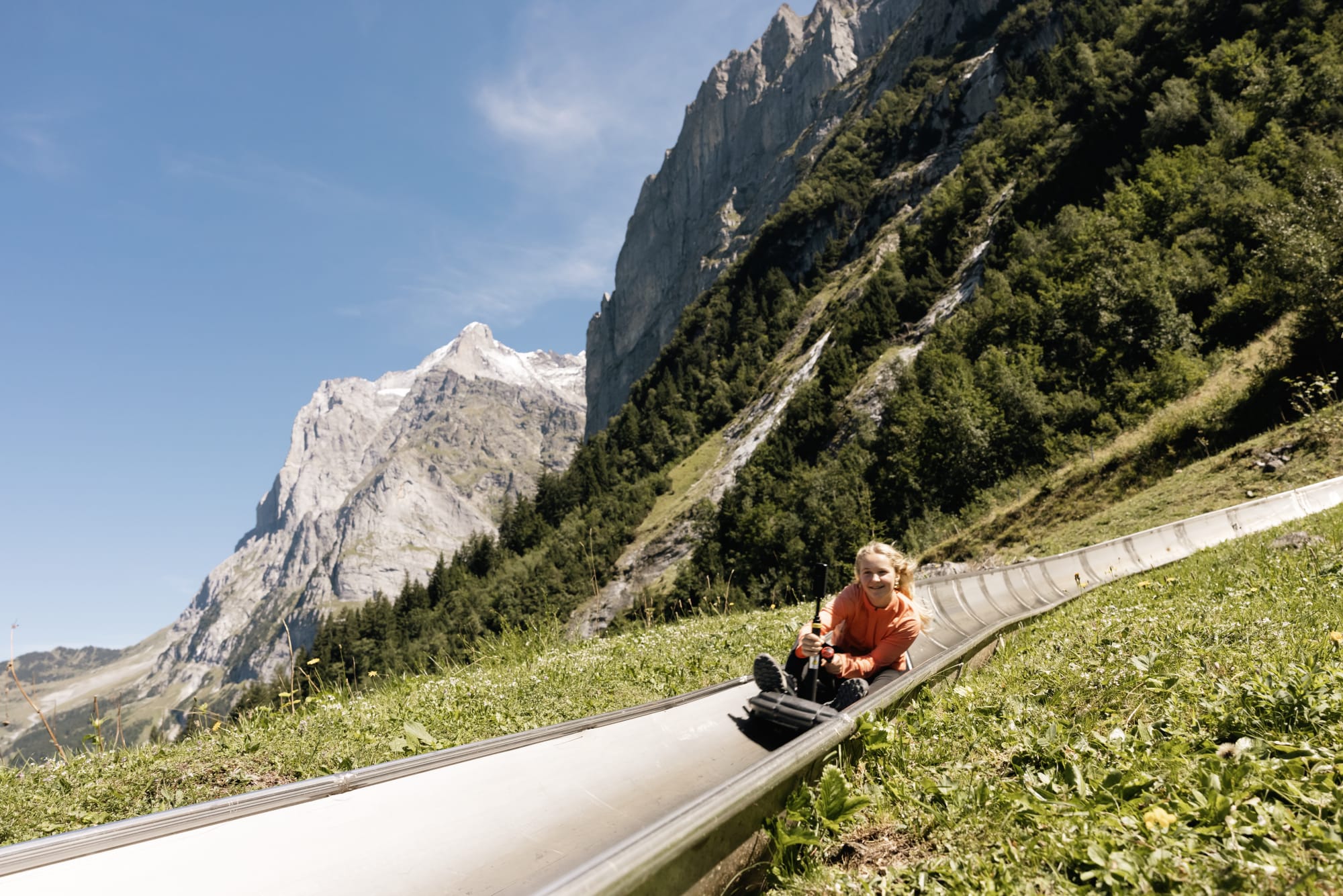 Geniesse eine rasante Fahrt durch saftige Alpwiesen auf unserer Rodelbahn – direkt hinter der Bergstation der Luftseilbahn.